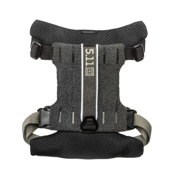 Taktisk hundesele fra 5.11 Tactical med håndtag på ryggen. Selen har 2 V-ringe, en foran og en bagpå, så du kan sætte din hundesnor i den du foretrækker. Rygstykket har velcropaneler med Molle, så du kan dekorerer selen med flotte K9 patches, flag eller andre velcromærker, som viser din og hundens personlige stil, eller tilføje små pouches til opbevaring. Understykket er foret for god komfort for hunden, og remmene er justerbare.