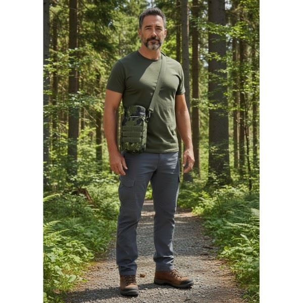 Isoleret bottlebag med MOLLE-system lavet i slidstærk polyester. Tasken er Molle-kompatibel, og med de 2 remme på bagsiden kan du sætte bottlepouchen fast på din rygsæk eller dit bælte. Så har du altid kolde eller varme drikkevarer lige ved hånden når du er på tur. Tasken kan også bæres som en skuldertaske, og de aftagelige skulderstropper er justerbare.