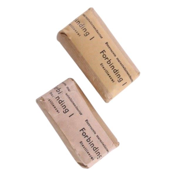 Originale forbindinger fra Forsvarets Materielintendantur. "Forbinding l". Steriliseret, dog ingen garanti for at de stadig er sterile.
