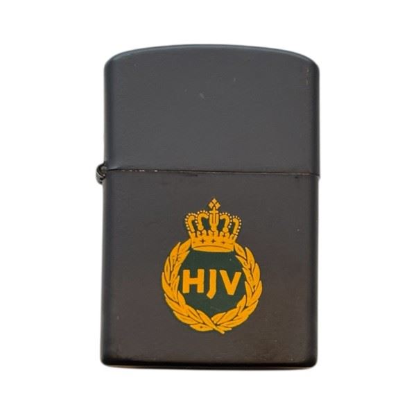 Lighter med Hjemmeværnets logo i et klassisk design. Lighteren er sort med hjemmeværnets logo "HJV" på forsiden, omgivet af den 2-delte lauerbærblade-krans og med kongekrone på toppen. Lighteren er genopfyldelig med lighterbenzin, du tager blot "inder" lighteren op fra etuiet og fylder på.