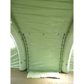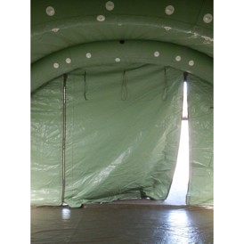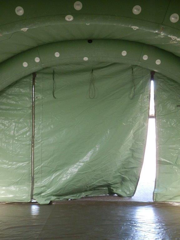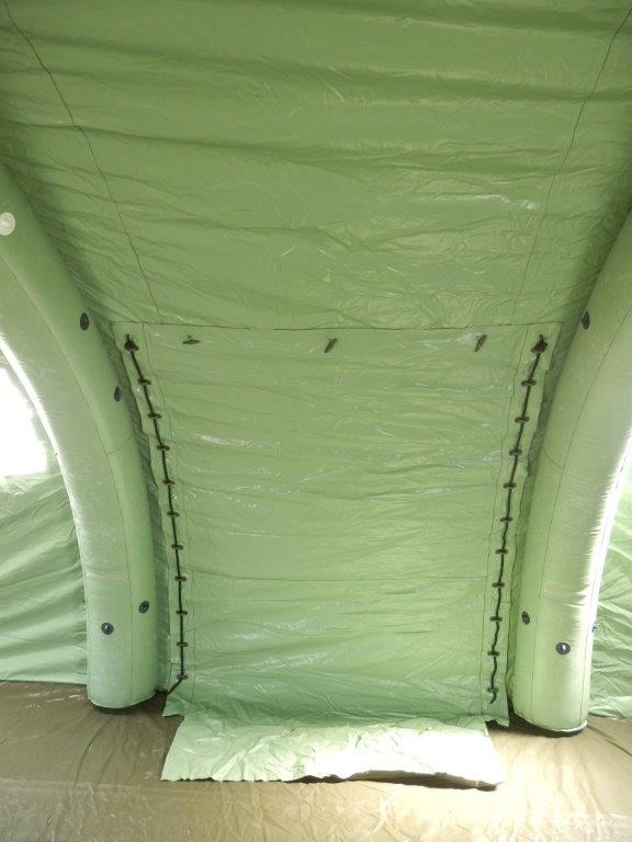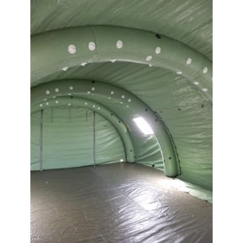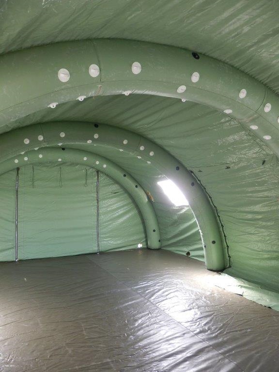 Dette militærtelt har ingen faste teltstænger men istedet oppustelige luftkanaler, som rejser og holder teltet oppe.