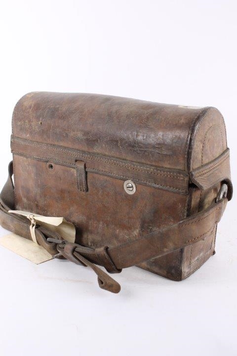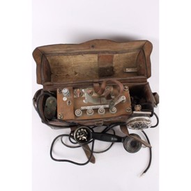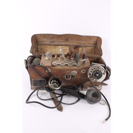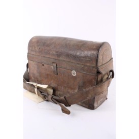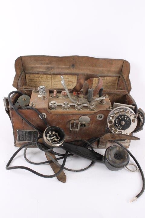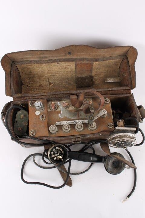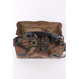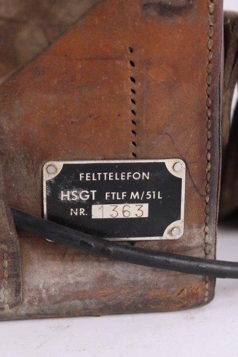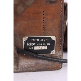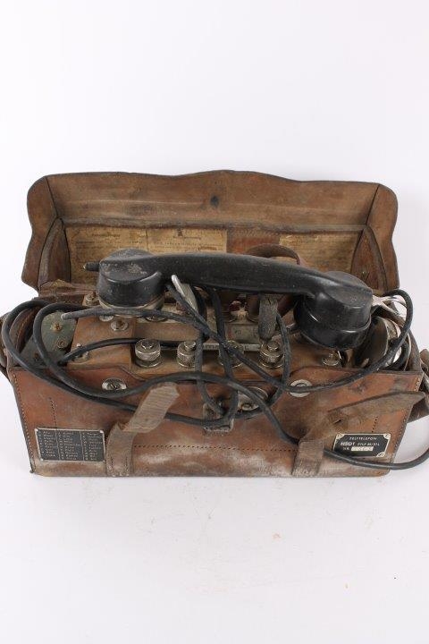 Original gammel svensk felttelefon i lædertaske med buet låg. Ingen funktionsgaranti.